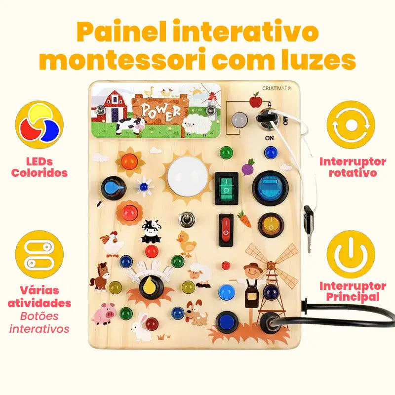Com interruptores interativos e luzes LED coloridas, seu pequeno explorador vai descobrir causa e efeito, coordenação mão-olho e desenvolvimento sensorial precoce, tudo enquanto se diverte sem parar! Os pais adoram como o brinquedo mantém as crianças entretidas sem telas, enquanto os pequenos não resistem aos botões brilhantes, luzes suaves e ilustrações com tema de fazenda.