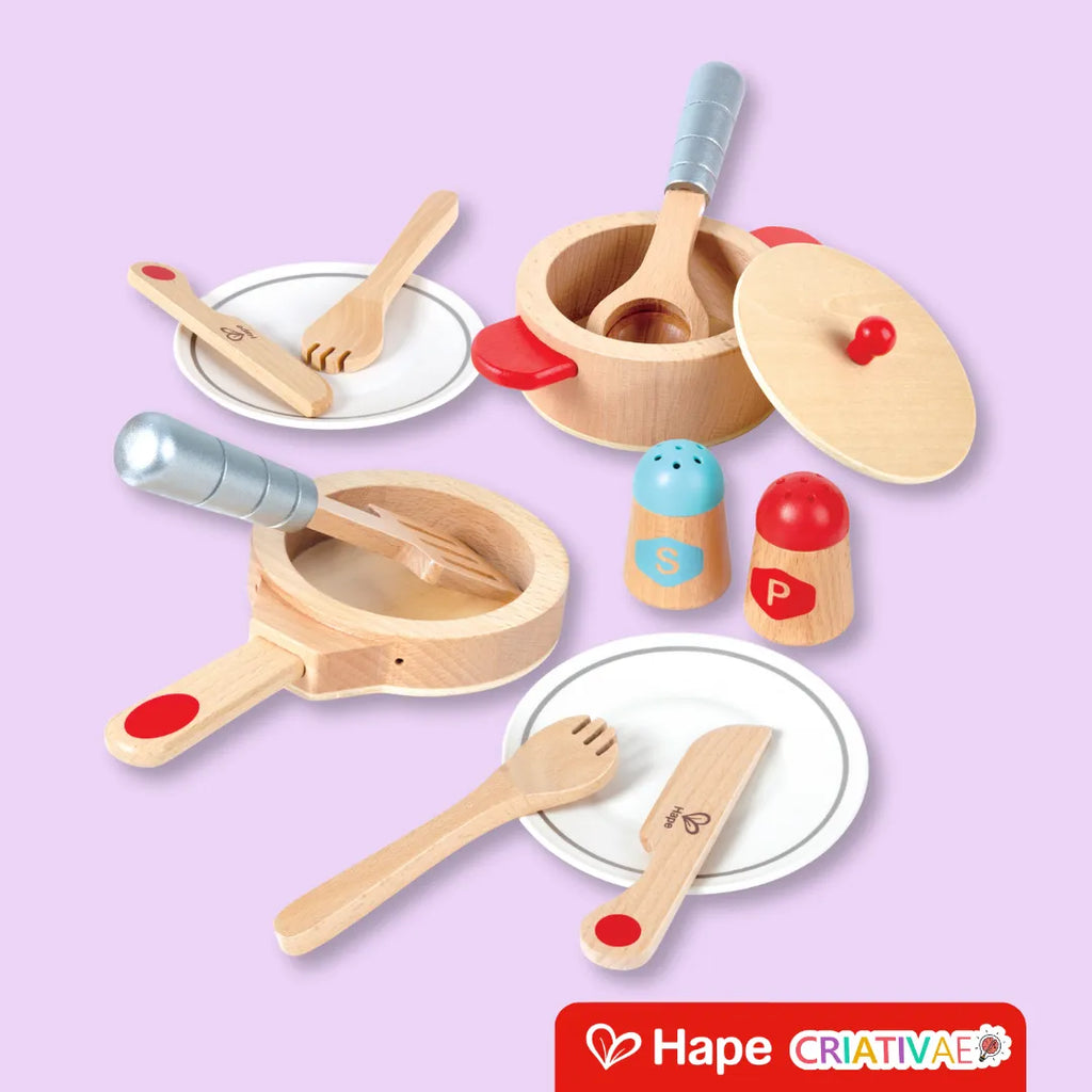 Inclui uma panela, frigideira, tampa, colher, espátula, dois pratos, facas, garfos e um par de saleiros e pimenteiros. Cada peça é feita de madeira resistente e apresenta elementos realistas, como o conjunto de sal e pimenta que faz barulho ao ser agitado!