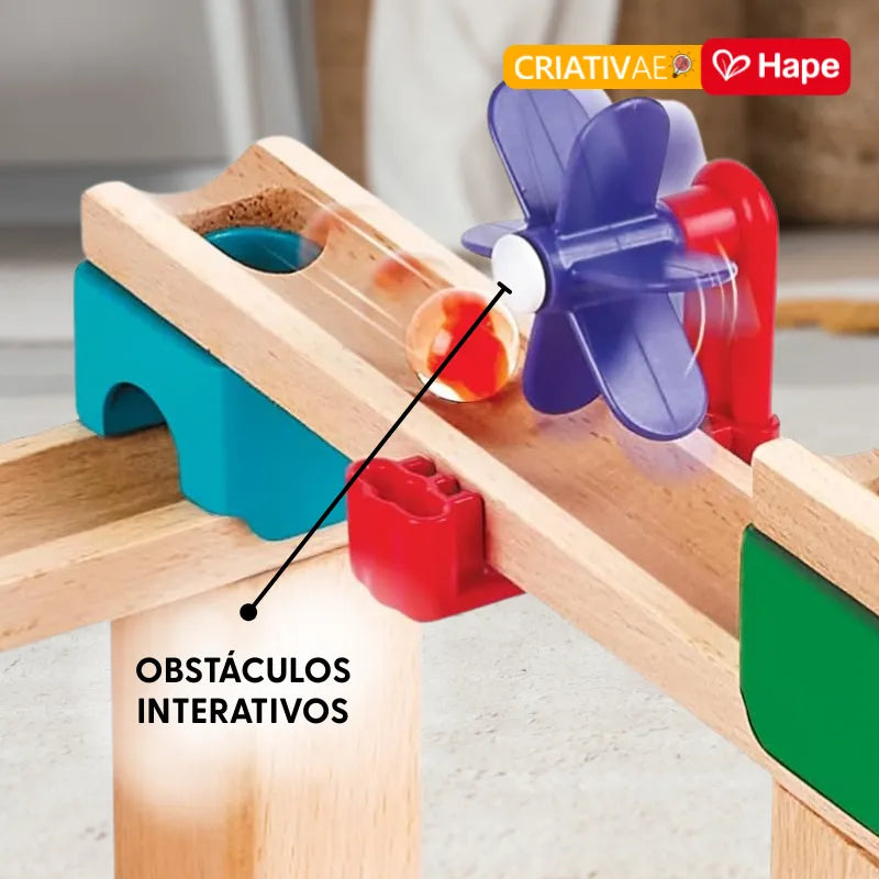 Muitos brinquedos de pista são "fechados", sem espaço para a criança criar. A Pista de Corrida DIY da HAPE, trazida pela Criativae, é um convite à engenharia infantil. Ela quebra a monotonia ao exigir planejamento real para que a bolinha passe pelo funil e atinja o objetivo final. É o equilíbrio perfeito entre a diversão de alta velocidade e o aprendizado sobre gravidade e lógica.